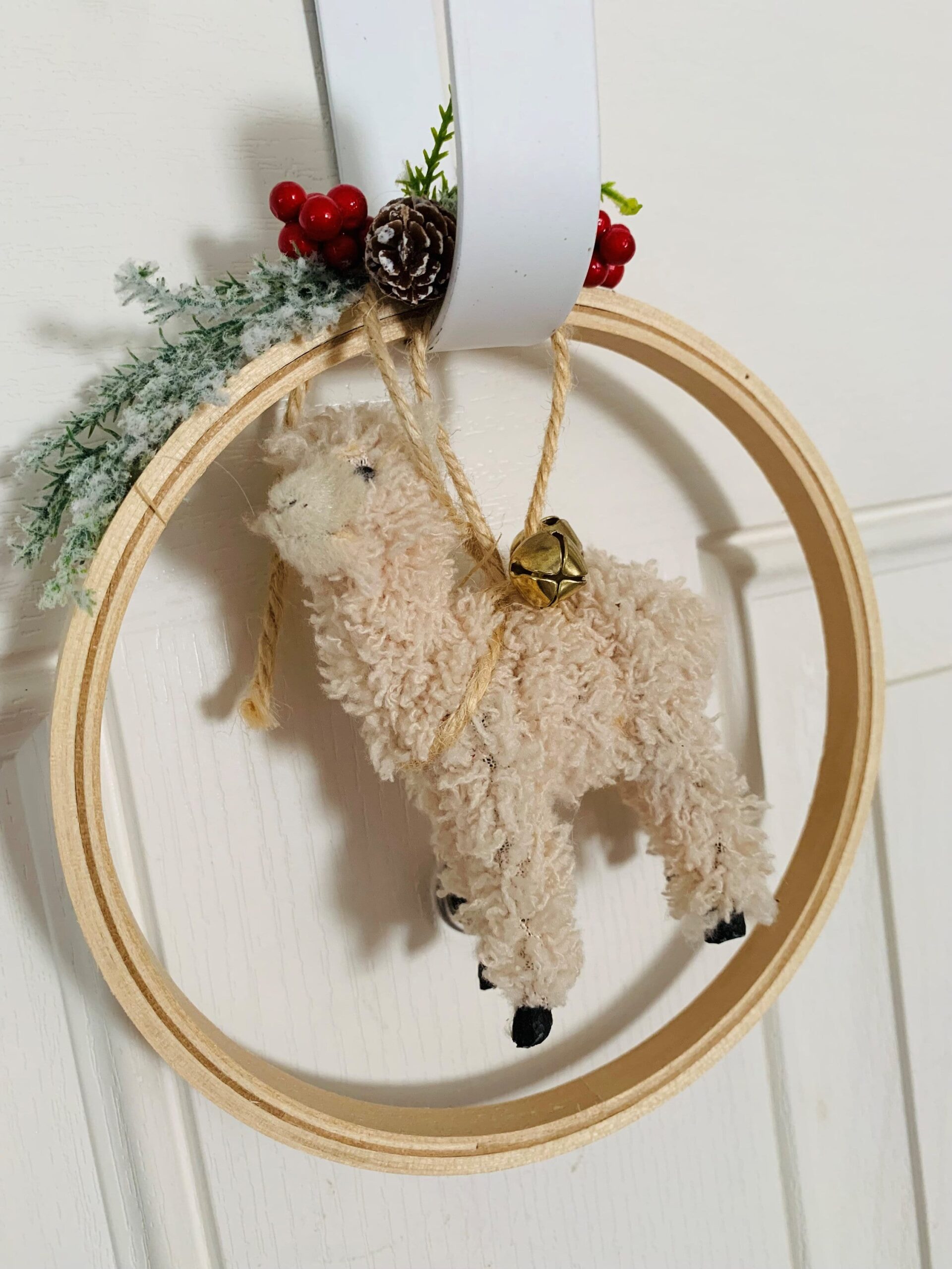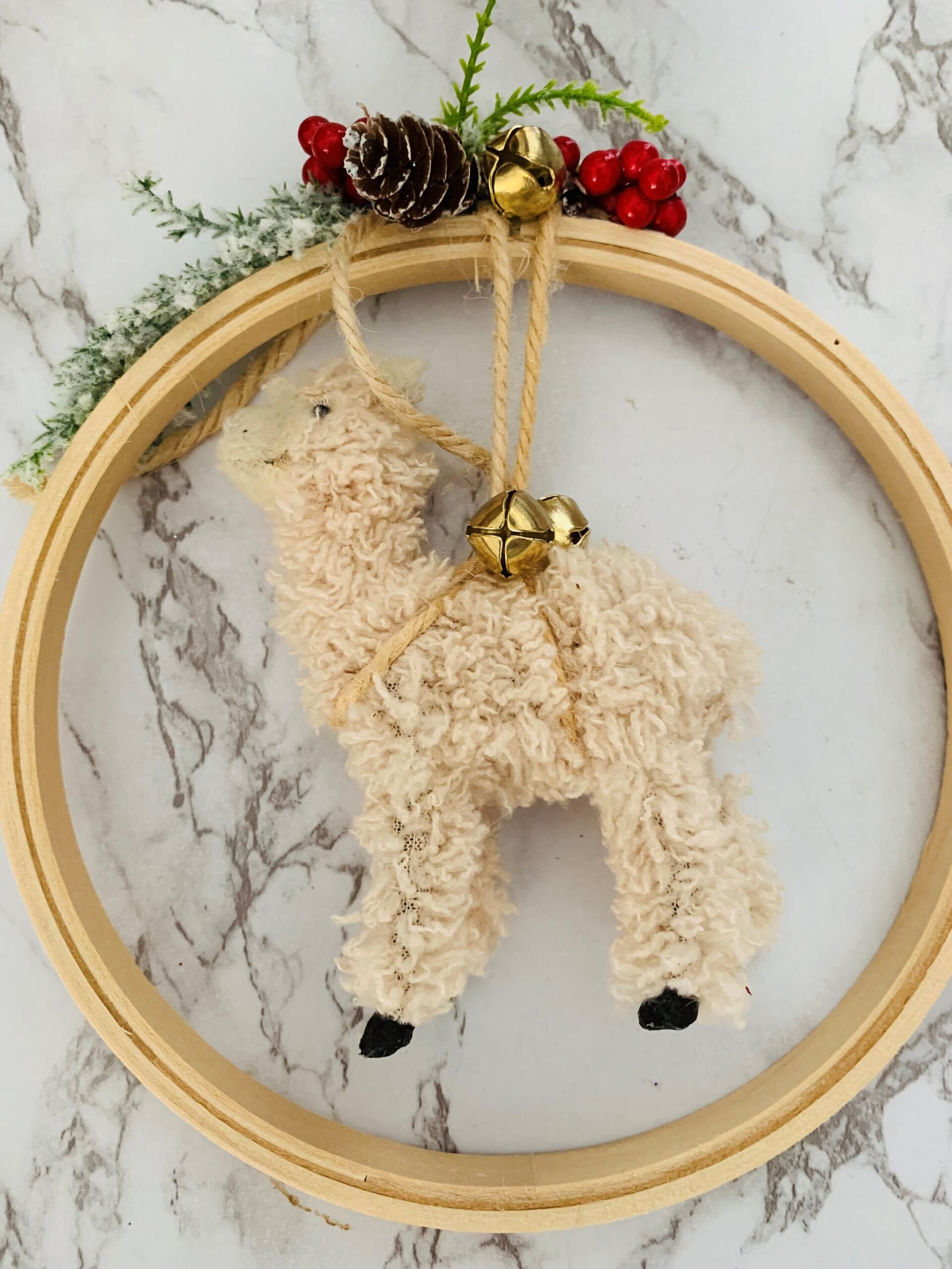 A four-inch llama suspends in an eight-inch wooden hoop. It could be hung in a window; it could be hung on a magnetic hook for a door or kitchen location.