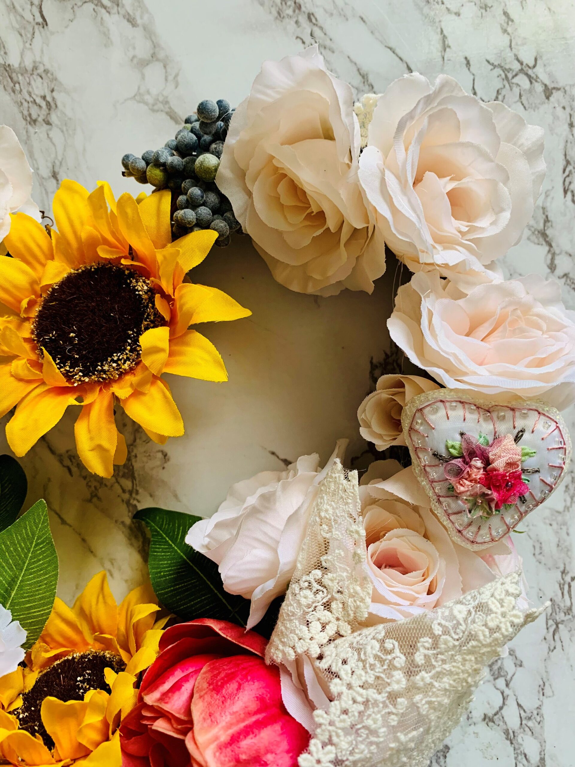 This is a ten-inch grapevine wreath embellished with assorted summer flowers making it about 12 inches across. Indoor or outdoor, it brings the garden to your doorstep. The vintage heart brooch is handmade needlework with precise micro details.