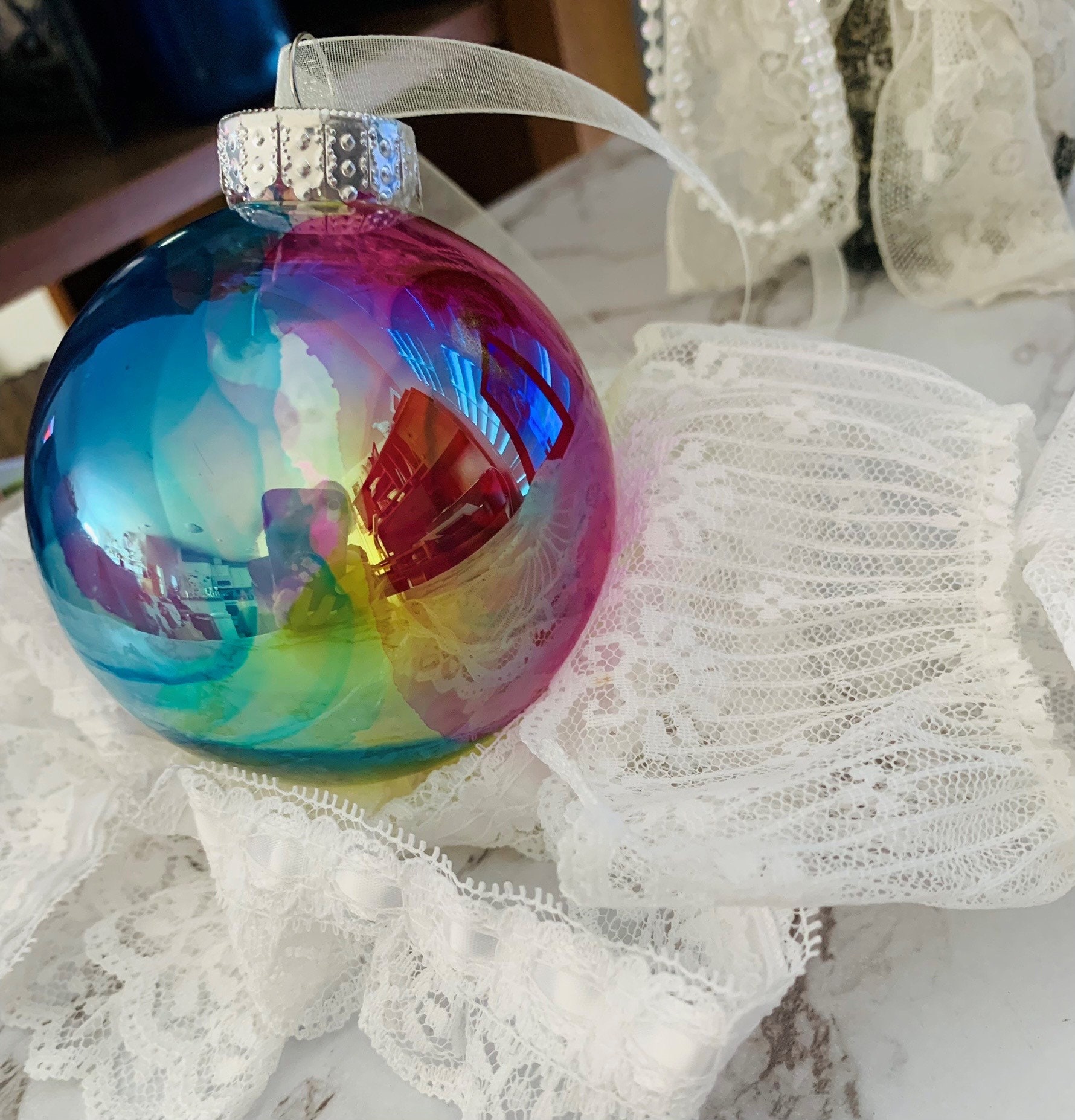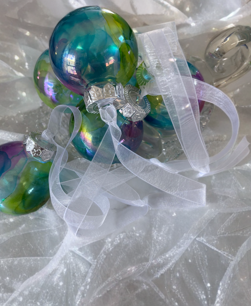 Six reverse alcohol ink painted unbreakable iridescent ornaments for a holiday tree. The color is relative to the room where the pictures are taken. The video on the tree gives you the best view of the color that you can expect. Thank you for considering them. Sandy