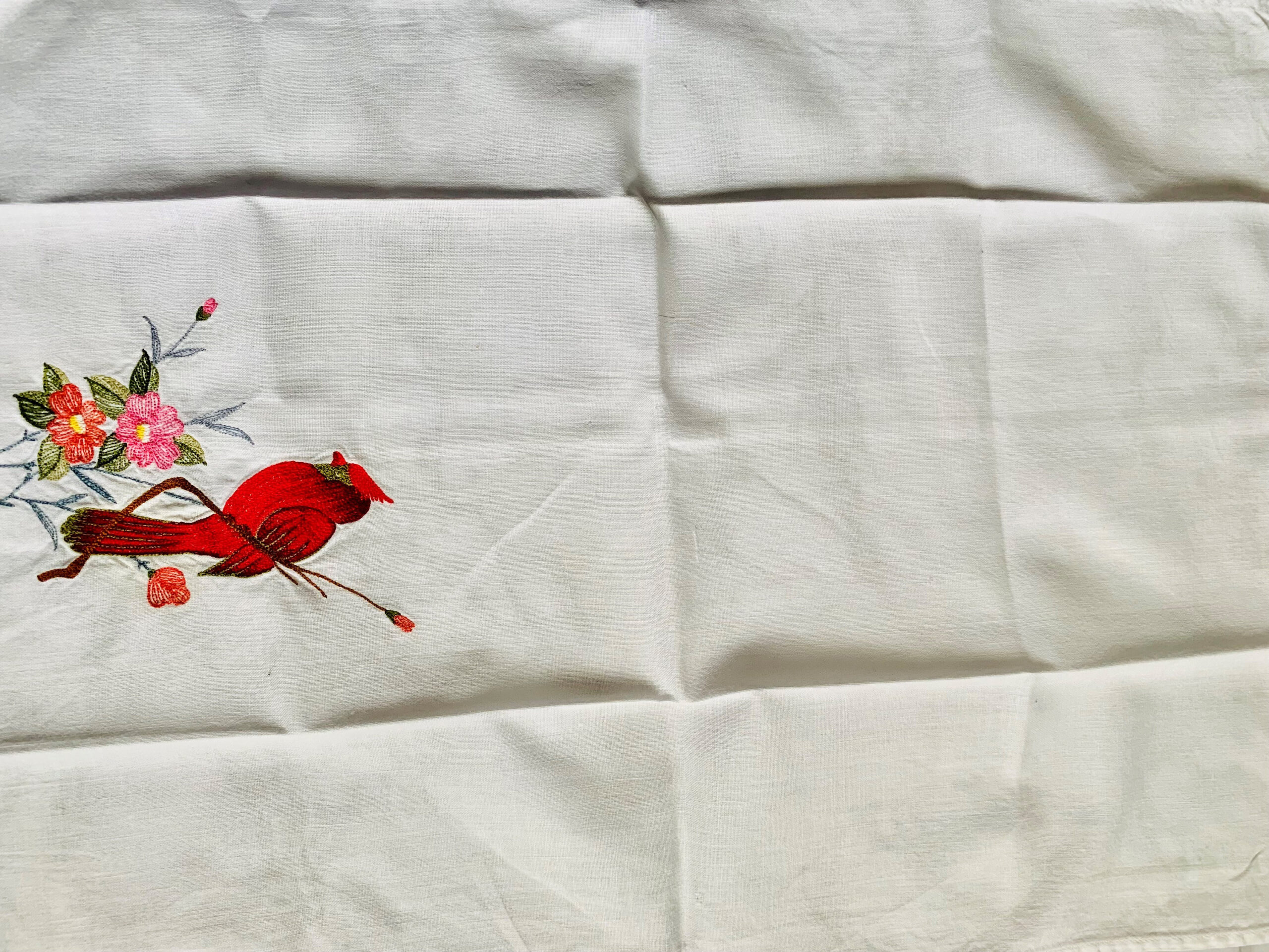 Machine embroidered cotton mallard duck and cardinal guest towels with scallop edging measuring 13X18 inches. Both are in vintage excellent condition.